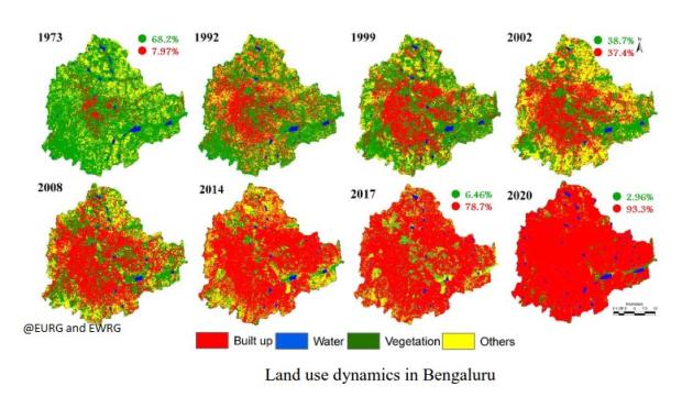 But in the 45 years, how did we get from being a ‘green’ city to a ‘grey’ one? “As population and its activities increase in a region, the boundary of the city expands to accommodate growth along the urban fringes, leading to urban sprawl with the fragmented urban morphology, thereby impacting local ecology at peri-urban areas and city outskirts”, says Dr. H.A. Bharath from IIT-Kharagpur, also a co-author of the study, detailing the reasons behind the urban sprawl that we witness now.