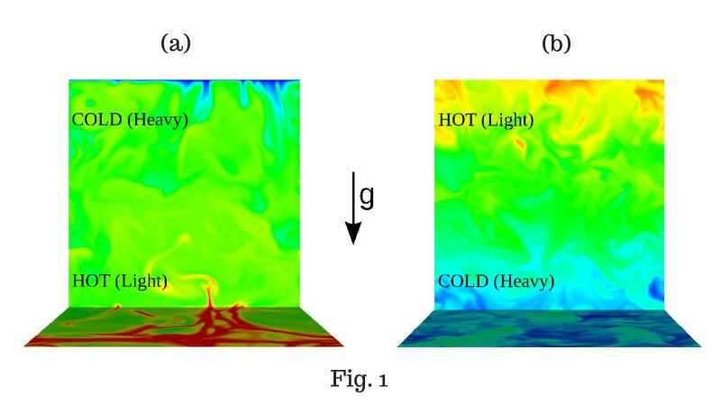 Buoyancy-driven turbulence, on the other hand, is somewhat different from fluid turbulence explained above. Buoyancy could feed or take away energy at different levels, and hence the energy-supplied at the largest level could be different from that dissipated at smallest level. Buoyancy affects the flow in two ways. In thermal convection (Fig 1(a)), the flow is destabilized since heavier or colder fluid is on top of a lighter or hotter fluid, and it leads to movements of the hotter fluid to the top. On the other hand, stably-stratified turbulence (Fig 1(b) in which a lighter fluid sits on top of a heavier fluid is stable; such flows are found in the Earth’s atmosphere.