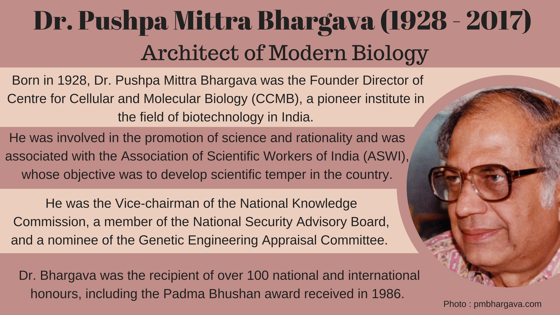 Pushpa Mittra Bhargava was born in Ajaymeru in Rajasthan on 22nd February 1928, to Ram Chandra Bhargava, a medical doctor, and Gayatri Bhargava. He was homeschooled until about the age ten, by his grandfather, after which he was directly admitted to class 9 in Varanasi. Having completing his Master’s in organic chemistry from Queens College, one of the best institutions in Uttar Pradesh back then, Bhargava joined Lucknow University for his Ph.D. By age 21, he was armed with a PhD in synthetic chemistry.
