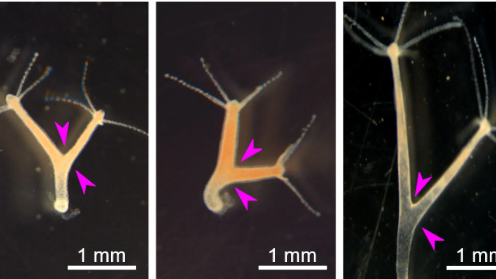Image: Hydra vulgaris with suppressed TMOD1 expression showing the non-detaching Y-shaped bud still attached to the parent Hydra. Credit: Authors, https://doi.org/10.1016/j.isci.2025.113759