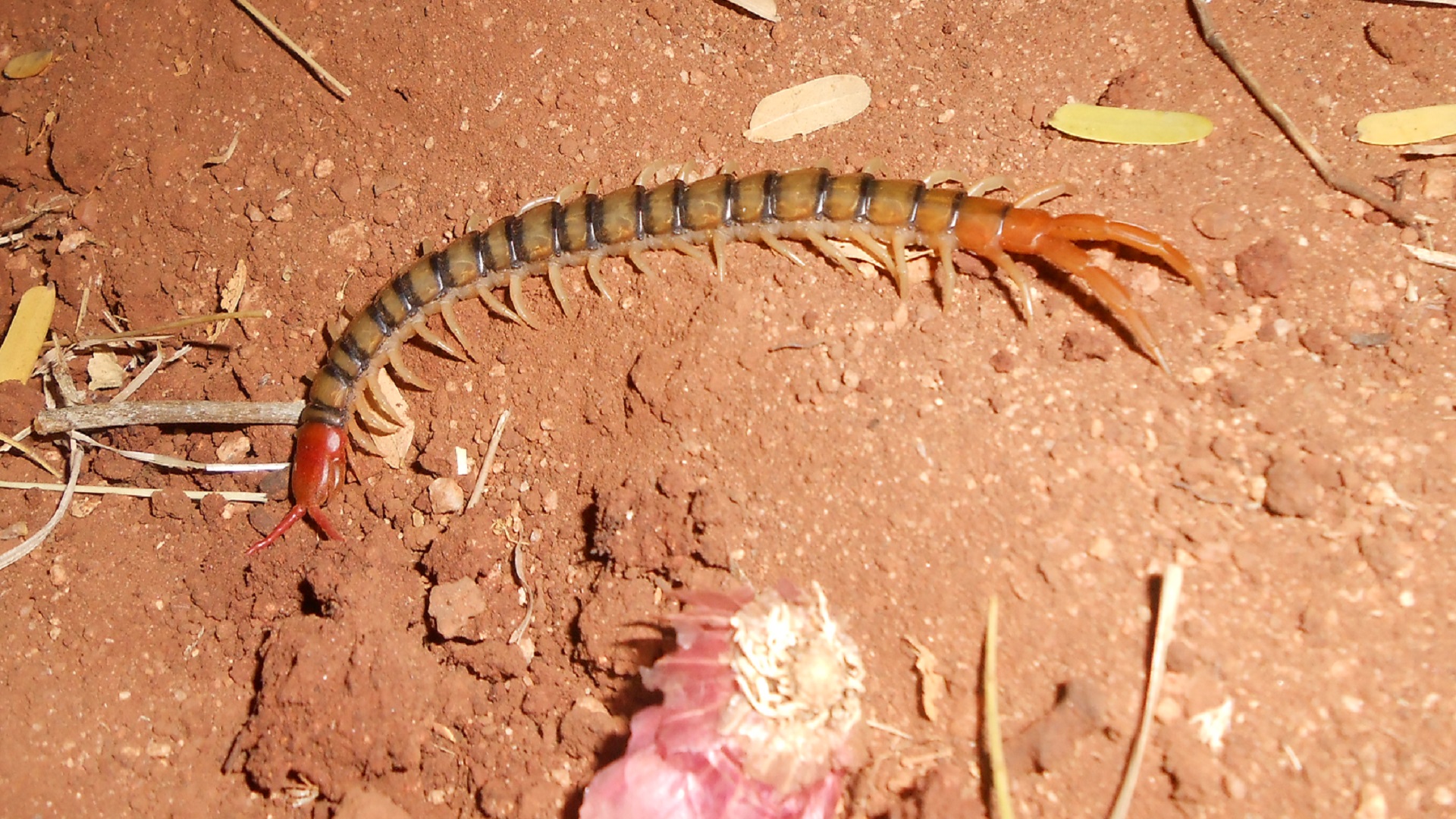 India is home to over a hundred species of centipedes belonging to 11 genera. Members of the genus Ethmostigmus belong to Scolopendridae, a family of large centipedes. These giant centipedes have modified claws that curve around their head and can deliver venom into its prey. The venom is toxic enough to cause severe pain in humans which can last for several days.