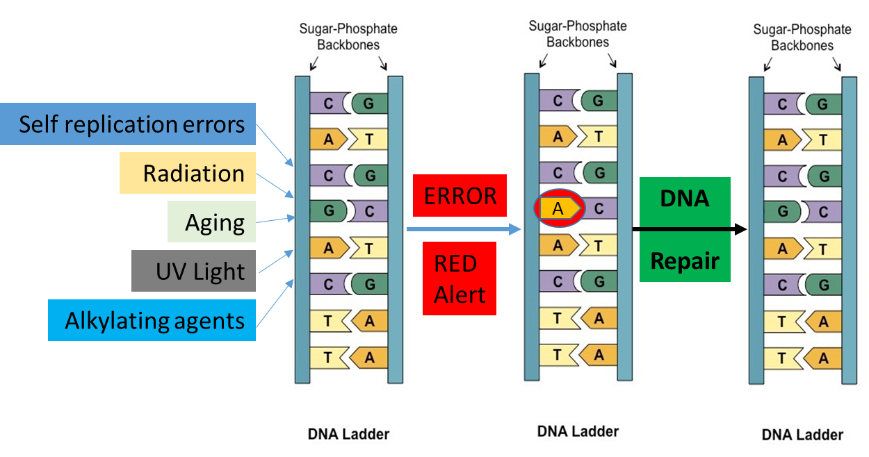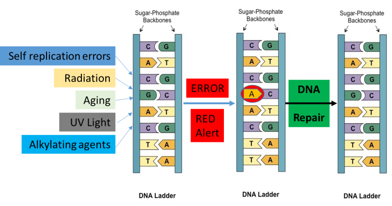 The bright side of things is that our body also has a mechanism to repair damaged DNA to keep our cells alive. Three scientists—Tomas Lindahl, Paul Modrich, and Aziz Sancar—were awarded the 2015 Nobel prize in Chemistry for their discovery of the mechanisms of DNA repair.