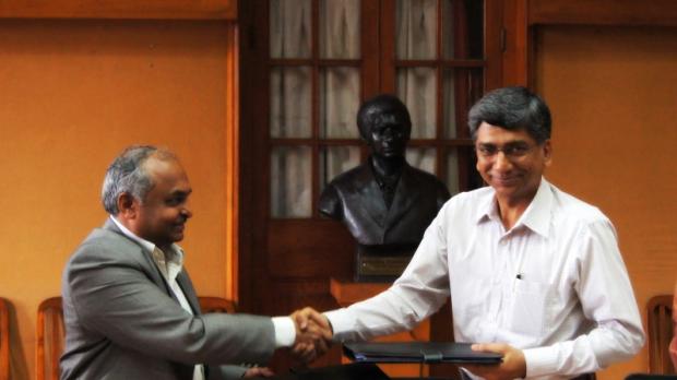 Prof. Anurag Kumar exchanging the agreement with Dr. Ajit Kalghatgi. Photo Credit: Siddharth Kankaria / Research Matters
