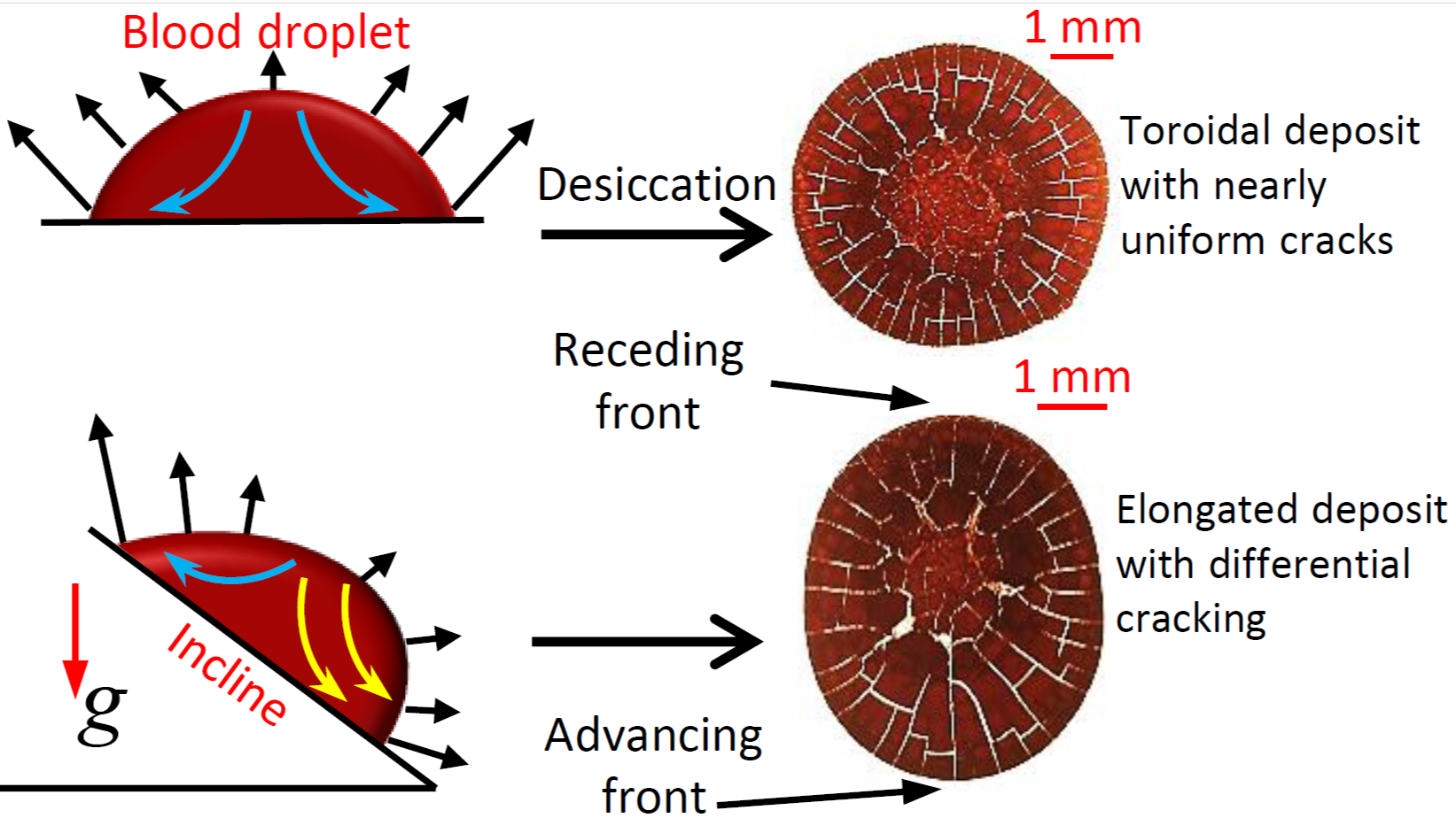 सपाट पृष्ठभागावर पडलेल्या रक्तातील शुष्कन संरचनांचा अभ्यास फॉरेन्सिक शास्त्रामध्ये सुरुवातीच्या काळापासून सुरू आहे. परंतु तिरक्या पृष्ठभागावर पडलेल्या रक्ताच्या थेंबामध्ये तयार झालेल्या शुष्कन संरचना काय सांगतात हा प्रश्न अद्याप अनुत्तरित होता. भारतीय तंत्रज्ञान संस्था मुंबई (आयआयटी मुंबई) येथील संशोधकांनी अलीकडील नव्या संशोधनाअंतर्गत, पृष्ठभाग तिरका केला असता रक्ताची शुष्कन प्रक्रिया आणि त्यात तयार होणाऱ्या भेगा यात (पृष्ठभाग सरळ/सपाट असल्याच्या तुलनेत) काय व कसा बदल होतो हे अभ्यासले.