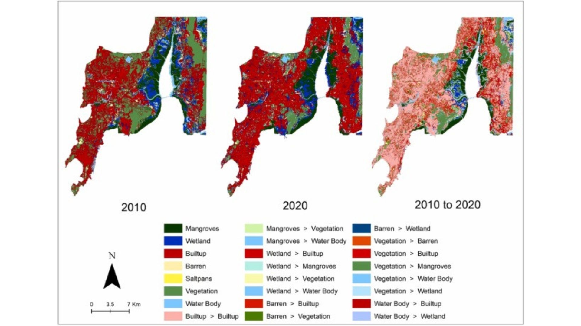 Left- LULC for the year 2010, Middle: LULC for 2020, Right- LULC change between 2010 and 2020 in Mumbai region. Credit: Authors