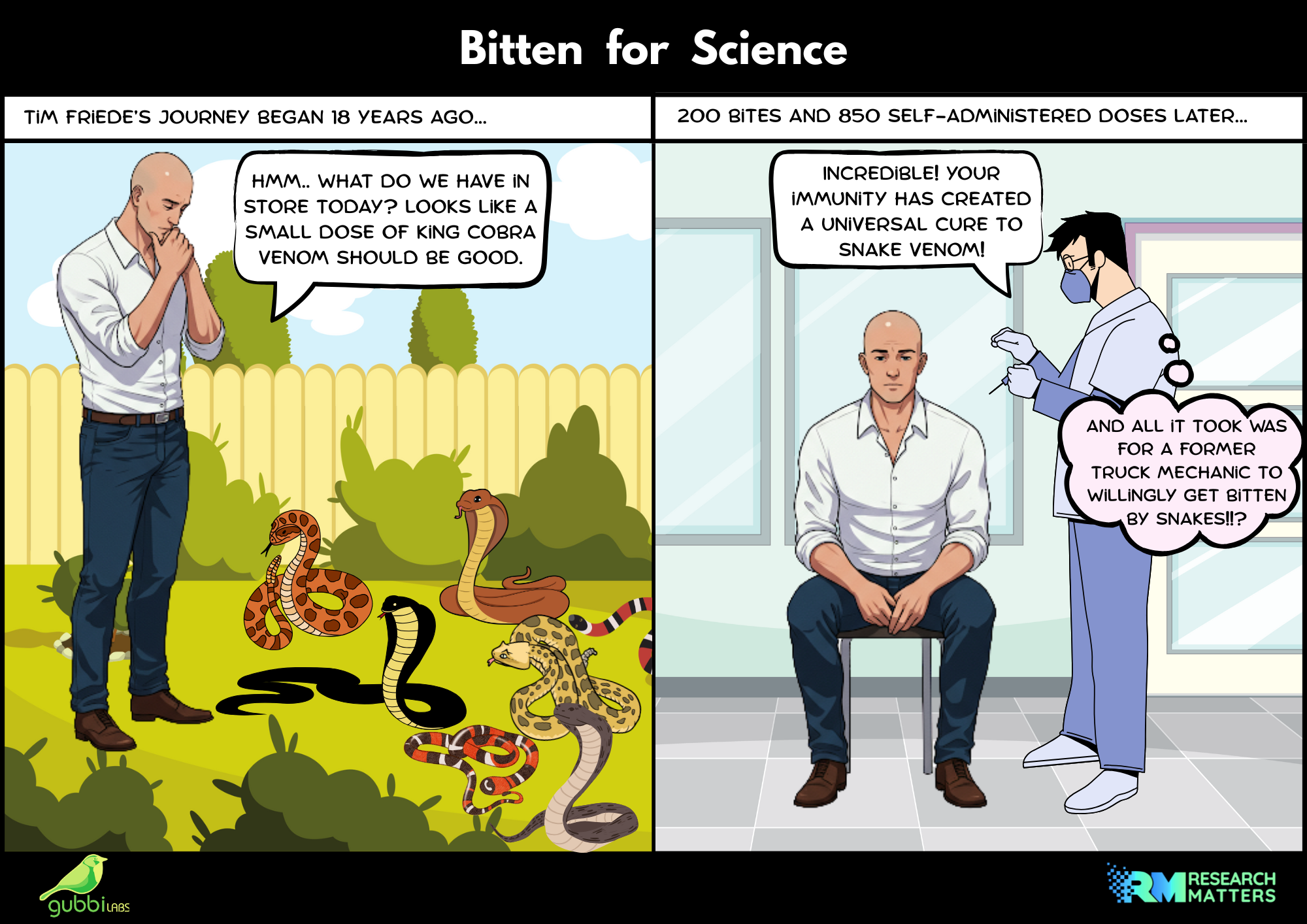 Scientists have developed a potent new antivenom using antibodies from Tim Friede, a US snake collector with extraordinary immunity built through years of extreme self-exposure. Friede intentionally subjected himself to 200 venomous snake bites and self-administered over 800 doses of venom from many of the world's deadliest species, including cobras, mambas, and taipans.