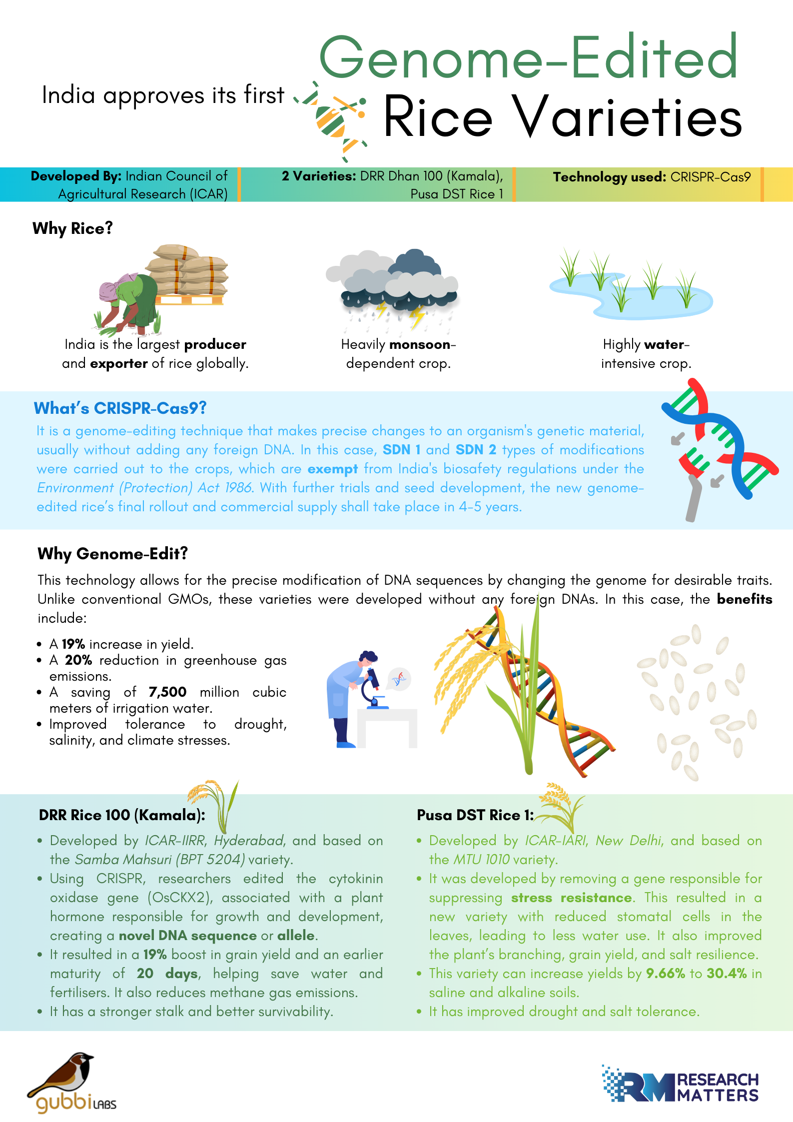 ICAR has developed two new genome-edited rice varieties – DRR Rice 100 (Kamla) and Pusa DST Rice 1 using genome-editing technology based on CRISPR-Cas9, which makes precise changes in the organism's genetic material without adding foreign DNA. Genome editing of Site Directed Nuclease - SDN 1 and SDN 2 types of genes has been approved under India's biosafety regulations for general crops.