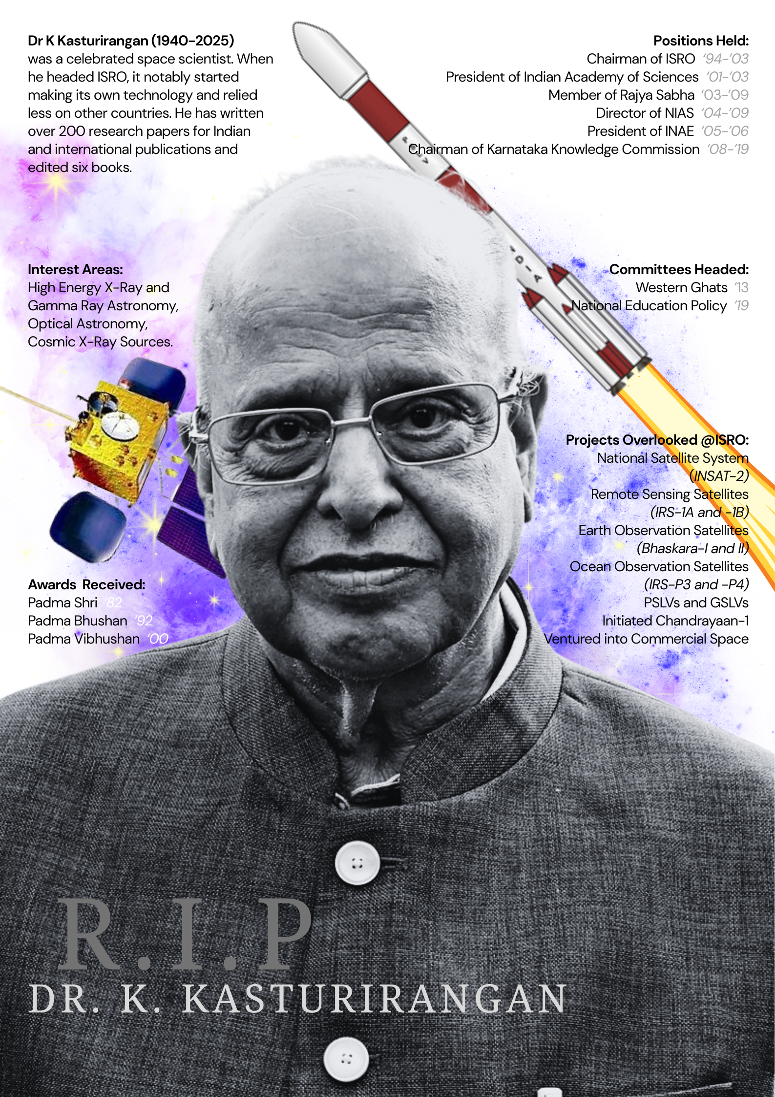 Dr. Krishnaswamy Kasturirangan, one of the architects of the modern Indian space program and a stalwart of Indian science, passed away on 24 April 2025 at the age of 84.