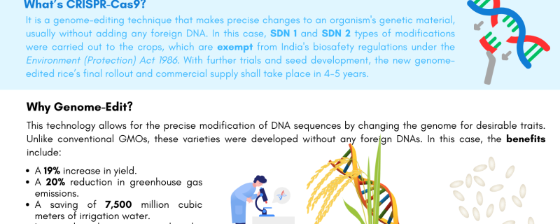 ICAR has developed two new genome-edited rice varieties – DRR Rice 100 (Kamla) and Pusa DST Rice 1 using genome-editing technology based on CRISPR-Cas9, which makes precise changes in the organism's genetic material without adding foreign DNA.